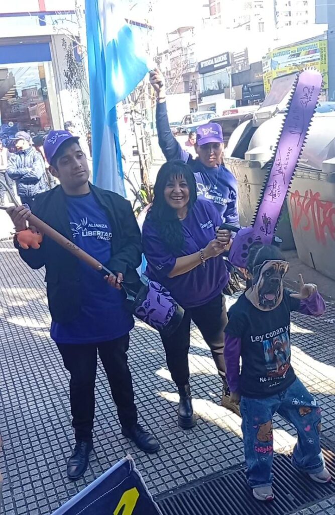 Milei decidió sumarse a la caravana pocas cuadras antes de llegar a Laprida, en pleno centro comercial de Lomas. “Apoyo a Javier Milei porque todo lo que dice es verdad y tiene razón”, dice una de las militantes acompañada de su hija de unos 7 años que llevaba una máscara de Conan y una motosierra de cartón. Del otro lado de la calle, un militante opositor al gobierno nacional gritaba “chorros” y “coimeros” de manera enfática y con ademanes agresivos hacia la parcialidad libertaria.
