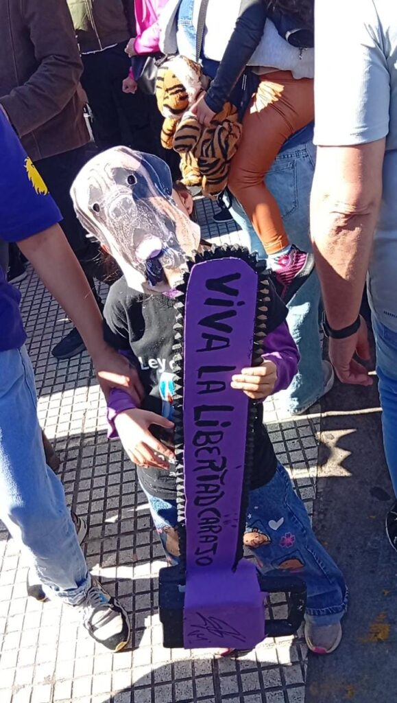 Al ritmo de Panic Show, la canción de La Renga, que es símbolo entre los libertarios, la gente marchaba por la avenida Hipólito Yrigoyen con máscaras de Conan, motosierras y las banderas de «Las Fuerzas del Cielo”, mientras vecinos y militantes opositores al gobierno los abucheaban desde las veredas y las casas.