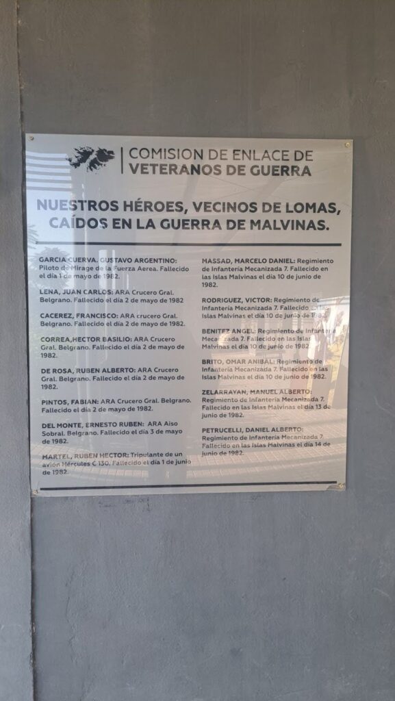 Tanto adentro como afuera del museo, hay placas que conmemoran a los 14 héroes caídos de Lomas de Zamora —ocho del Ejército, cuatro de la Armada y dos de la Fuerza Aérea— como la que está en el patio junto al jardín: “El pueblo de Lomas de Zamora, en reconocimiento a quienes cayeron defendiendo nuestra soberanía en las Islas Malvinas: Ángel Benítez, Omar Aníbal Brito, Francisco Cáceres, Héctor Basilio Correa, Ernesto Del Monte, Rubén Alberto De Rosa, Gustavo Argentino García Cuerva, Juan Carlos Lena, Rubén Héctor Martell, Marcelo Daniel Massad, Daniel Alberto Petrucelli, Fabián Pintos, Víctor Rodríguez y Manuel Alberto Zelarrayan”.