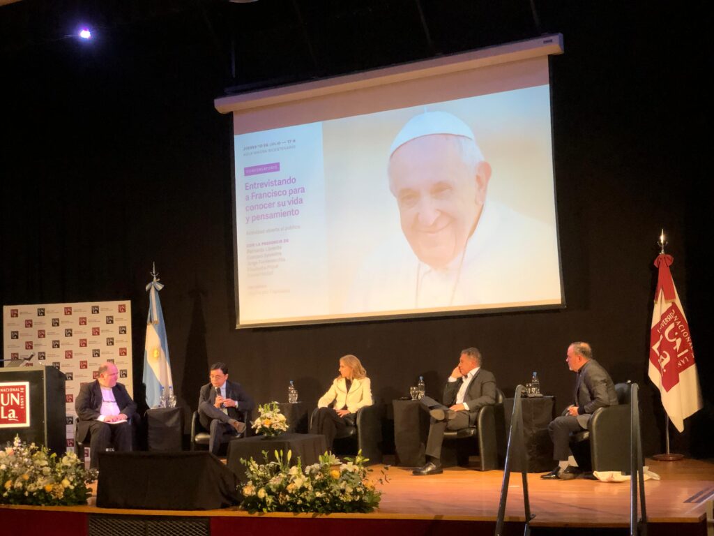 En un aula magna llena de autoridades académicas, referentes de la Iglesia y estudiantes, los periodistas Elisabetta Piqué de La Nación; Bernarda Llorente (ex Telám); y Gustavo Sylvestre de C5N; y los directores de Perfil, Jorge Fontevecchia; y de Infobae, Daniel Hadad, repasaron durante la tarde del jueves 10 de julio el legado de Jorge Bergoglio durante su pontificado.