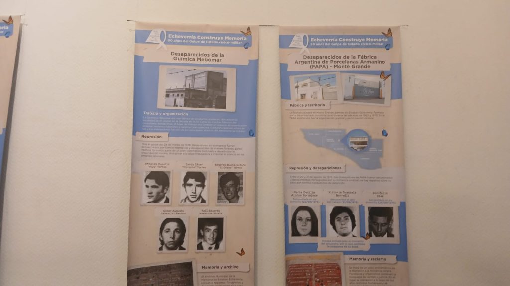La muestra Echeverría construye memoria también recupera la historia de la química Mebomar, en El Jagüel, donde cinco trabajadores fueron detenidos de manera ilegal entre 7 y 8 de diciembre de 1976. Ellos eran los hermanos Dardo, Edgardo y Armando Torres, Raúl Manrique y Óscar Sarraille.